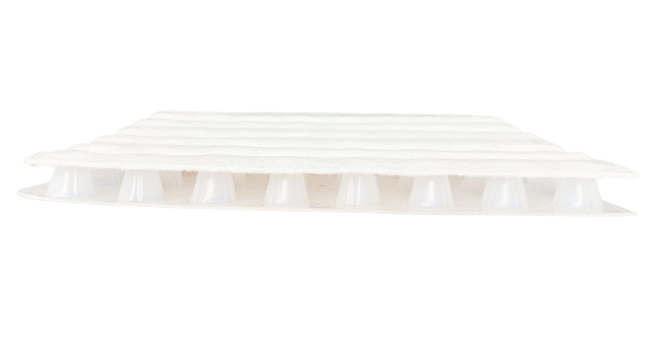5. 防塌陷设计:PVC排水板采用高低支点矩阵式排列,形成了任何局部范围都有核心支点的支撑结构,覆土后土工布在种植层压力下本能下陷,局部重心必然落在低支点而不会塌陷,从而保证了排水空间。